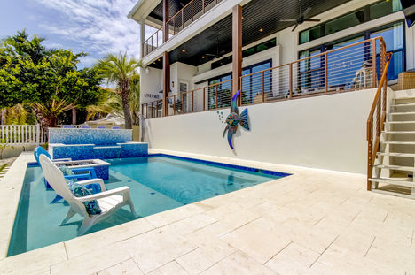 Story: This client knocked down a rental property to custom build. The lot was prime real estate on the Intracoastal, but small, so we built up. This resulted in an impeding front elevation, which we softened with mixed materials. The bottom is coquina (some the client harvested himself from local seashells) and the top is vinyl shake. Levels are divided with a scallop detail made from architectural foam which visually weights the bottom. A trellis, shutters, gas lanterns, copper and wood details complete the façade, sitting behind a driveway of artificial turf with pavers in a grid. For the outdoor living spaces, we got creative to maximize space and provide multiple opportunities for lounging, dining and entertaining. A conversation space off the stacking sliders to the living room includes a narrow privacy wall housing a TV/fireplace. Near the outdoor kitchen is the pool bath, a whimsical experience with a chalkboard wall, an octopus tentacle door handle, industrial lighting with nautical rope, and angled trim details. Downstairs on the tumbled marble deck is a bar integrated into the jacuzzi to allow for circulation around the perimeter while providing seating by the pool. The jacuzzi features glass tiles, hand-placed for an ombre effect. Pool features include underwater speakers and a multi-level sundeck with built-in fire pit. All of this adjacent to a low-maintenance lawn matching the driveway. The ledge dividing deck and lawn was painted bright blue as an added detail visible from the dock/boat. Materials/furnishings were selected to withstand the elements and salt air.